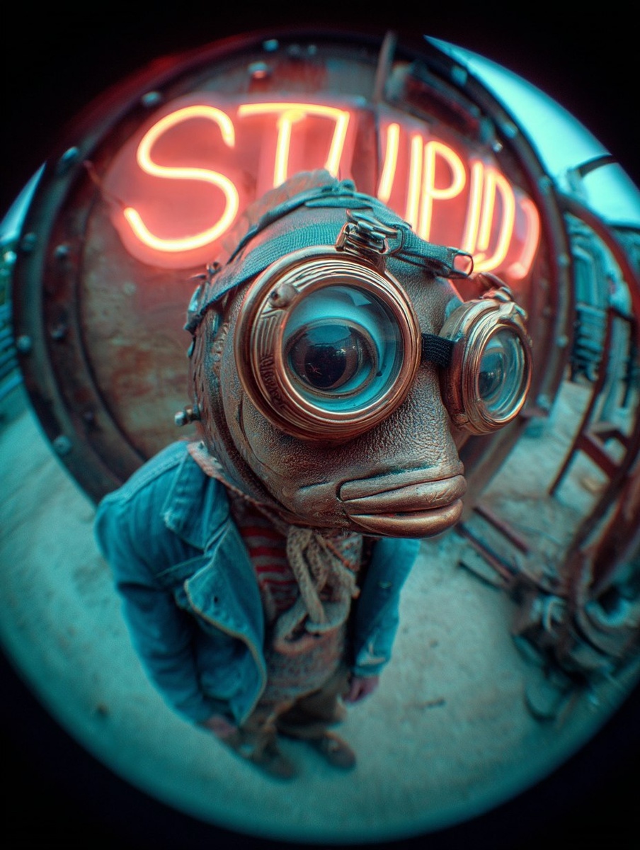 Создано на основе запроса: "Stupid " in neon text , Fisheye lens crafter tuna man --- Автоперевод: «Глупая» в неоновом тексту, мужчина из линзы рыбейка Круто получилось? 🤔 https://dzen.ru/id/65c0c65c86e4f837c27b24d7 #ИИ #AI #нейросеть #midjourney #art