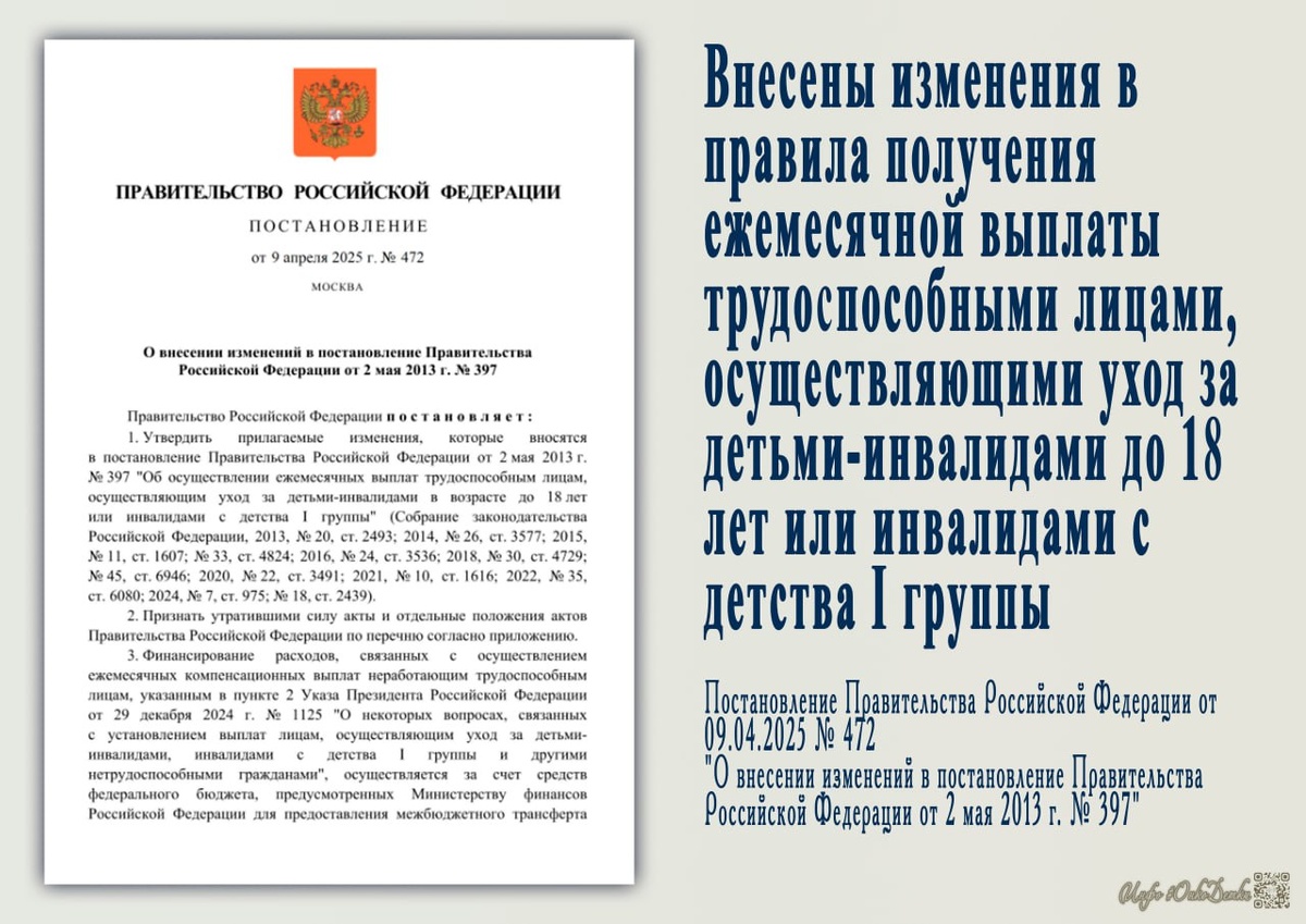 Внесены изменения в правила получения ежемесячной выплаты трудоспособными лицами, осуществляющими уход за детьми-инвалидами до 18 лет или инвалидами с детства I группы (для ЛОУ) 📃 Постановление Правительства РФ от 09.04.2025 N 472 "О внесении изменений в Постановление Правительства Российской Федерации от 2 мая 2013 г. N 397" Ключевое: эти изменения касаются преимущественно случаев, когда уход оформлен НЕ на родителя ребенка, а на другое неработающее трудоспособное лицо (брата/сестру и т.д.) Что изменилось? Если уход за ребенком-инвалидом осуществляет не родитель или опекун, а другой человек (например, родственник или знакомый), то введены дополнительные меры контроля: ▪️Лицо, осуществляющее уход, должно будет ежегодно подтверждать факт осуществления ухода. ▪️Необходимо подтвердить обязательство обеспечивать уход не менее 14 часов в неделю (питание, гигиена, здоровье, социализация). Подтверждать объем ухода, вероятно, потребуется в заявлении. ВАЖНО: Пока неясно, как именно нужно буде