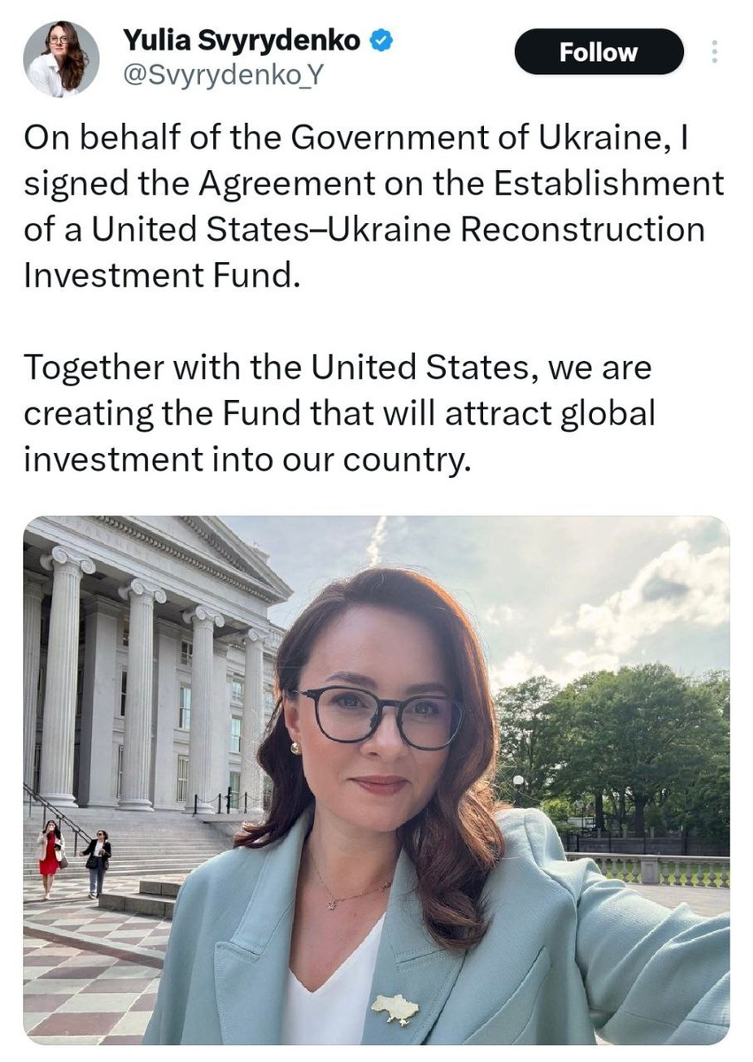 В ответ на пост Ukraine's Economy Minister with a selfie to celebrate minerals deal Her full statement says 'full ownership and control remain with Ukraine' and it's based on 'equal partnership'. Really trying to sell that fact that it's a good deal for Zelensky... #US #Ukraine