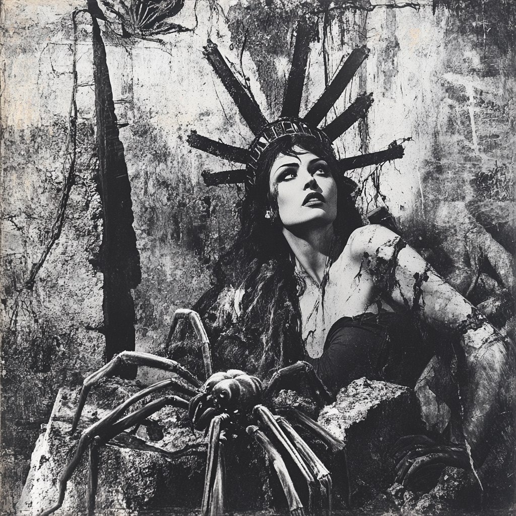 Создано на основе запроса: Luis Royo liberty statue dotty cosmetics striped spiders archeological dig