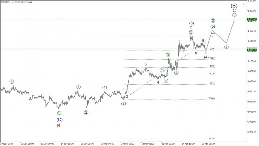 https://basechop.ru/wordpress/?p=40753 Предполагается, что в долгосрочной перспективе по криптовалютной паре EUR/USD формируется крупный зигзаг (A)-(B)-(C). Сейчас формируется крупная коррекционная волна (B), которая принимает форму восходящего зигзага A-B-C. На четырехчасовом таймфрейме представлена разметка конечной части коррекции B, после которой цена пошла вверх в импульсе C. Волна C – импульс, состоящий из подволн [1]-[2]-[3]-[4]-[5]. Завершены только первые две части – импульс [1] и коррекция [2]. В ближайшее время ожидается развитие второй половины крупной импульсной подволны [3], как показано на графике. Есть большая вероятность, что вся импульсная волна C завершится в районе предыдущего максимума 1.186. Однако после волны [3], ожидается небольшой откат вниз в коррекции [4], которая может принять любую коррекционную модель. Пока сложно сказать какую. В текущей ситуации можно рассматривать открытие длинных позиций с целью забрать прибыль на завершении импульсного тренда. Либ
