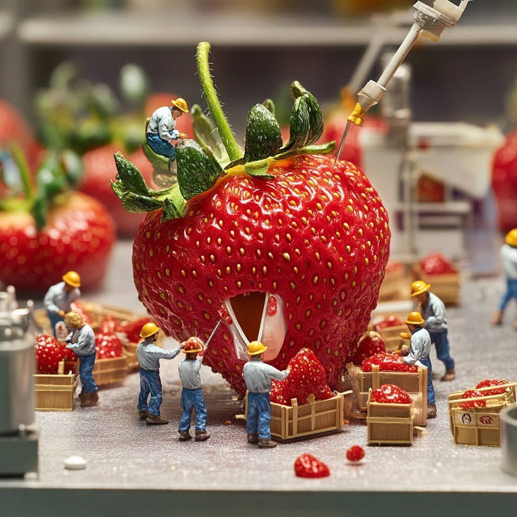 Создано на основе запроса: A highly detailed miniature scene featuring tiny workers harvesting a massive strawberry as if it were a