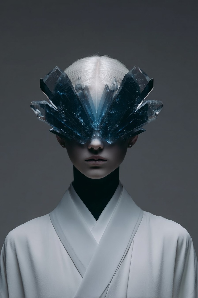Создано на основе запроса: close up humanoid diamond crystal mine wearing a kimono robe, face and headdress made from crystal fractures