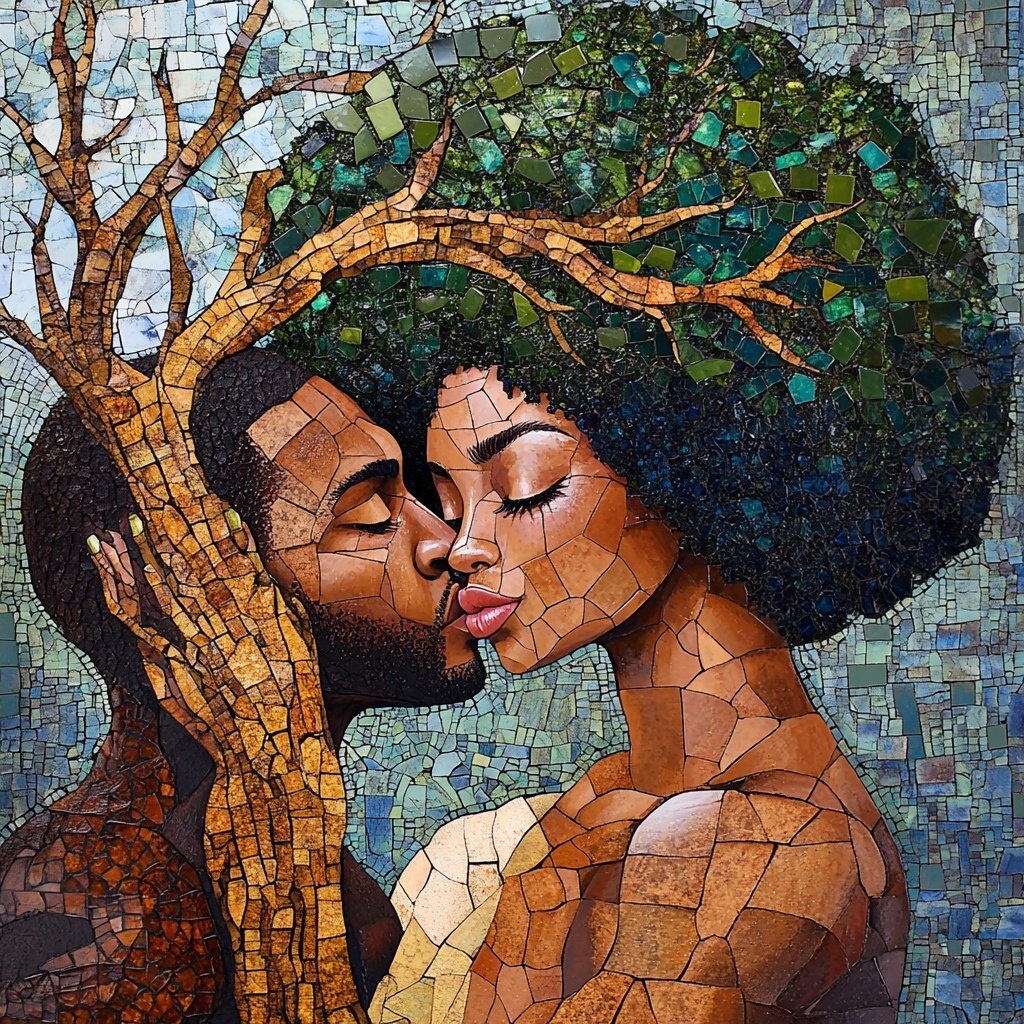 Создано на основе запроса: a mosaic colorful picture of a pretty brown skin black woman with round nose with her hair green in a huge afro that resembles a tree branch crying while kissing her man --- Автоперевод: Мозаика красочная картина красивой коричневой кожи чернокожи Отлично вышло? 🤔 https://dzen.ru/id/65c0c65c86e4f837c27b24d7 #ИИ #AI #нейросеть #midjourney #art
