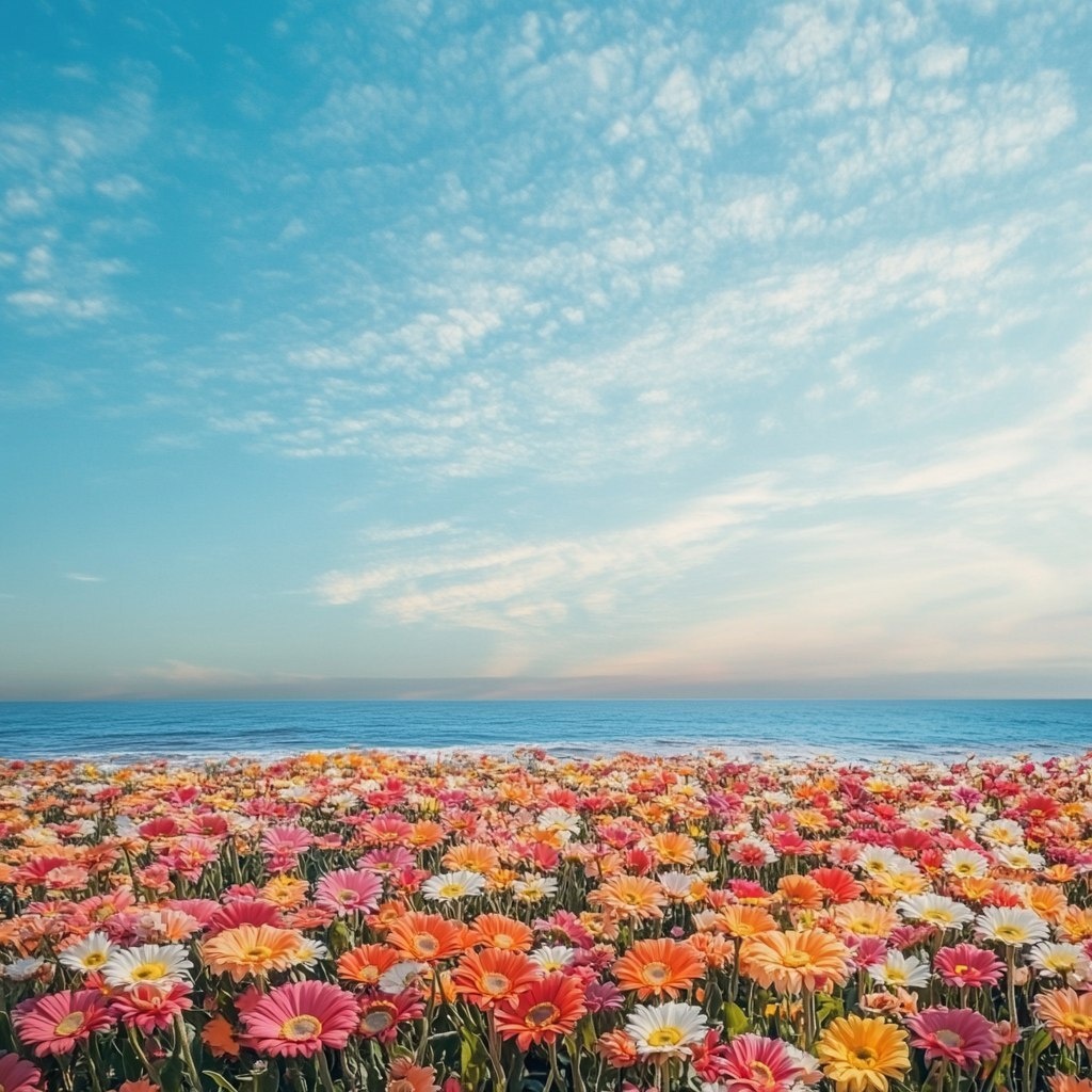 Создано на основе запроса: Sky and sea, gerbera flower field in the foreground, gerberas are colorful, sunny, horizontal