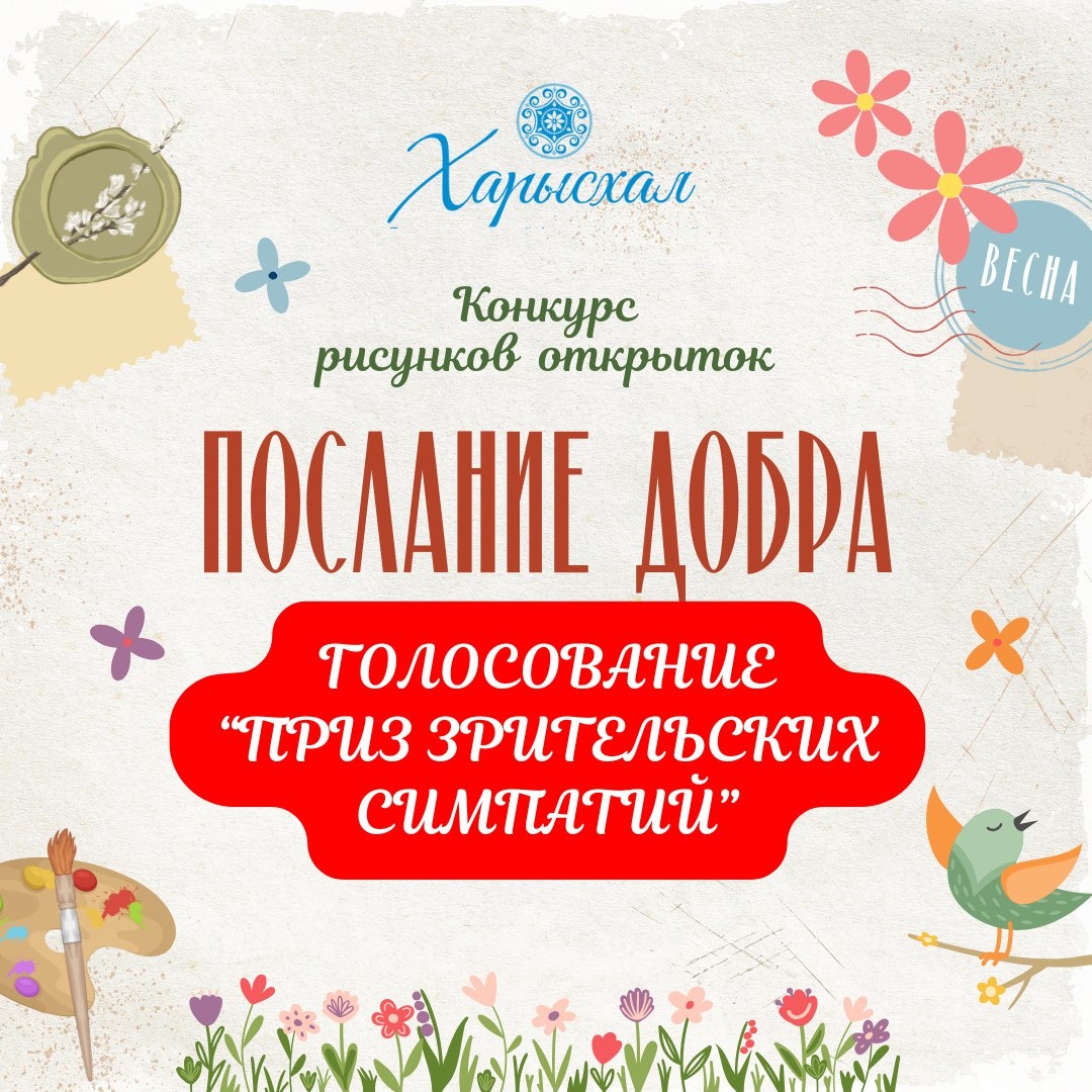 🎉Запускаем голосование «Приз зрительских симпатий» среди работ участников конкурса рисунков для открыток «Послание Добра»! 🗳️Голосование продлится до 23:59 ч. 04 мая 2025 года 👉Голосование проходит в виджете ВКонтакте. Все участники разделены на 2 группы, чтобы вам было проще выбрать! Один победитель будет выбран из обеих групп на основе наибольшего количества голосов. Обращаем внимание, к голосованию не допущены работы не связанные по тематике конкурса, безымянные работы, и работы участников не входящих в возрастную группу конкурса. ⚠️Для честности и во избежание накруток голосовать могут только участники сообщества ВКонтакте фонда «Харысхал». 🛜1 группа — https://vk.com/app7198399_-59756272#poll681249daef35b7591d3c8f5c 🛜2 группа — https://vk.com/app7198399_-59756272#poll68124dd2ef35b7591d3c9159