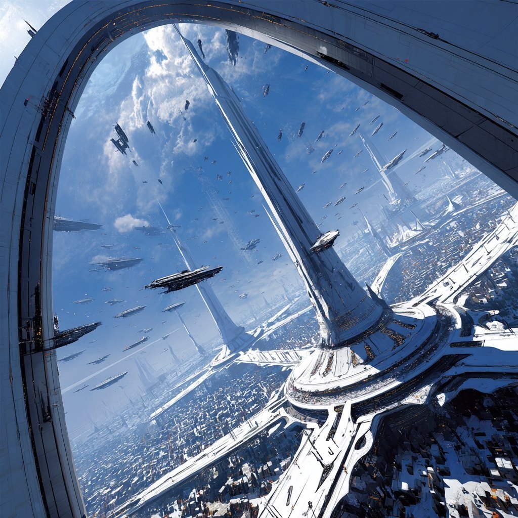 Создано на основе запроса: Near-future city, orbital elevator, orbital architecture, space fleet