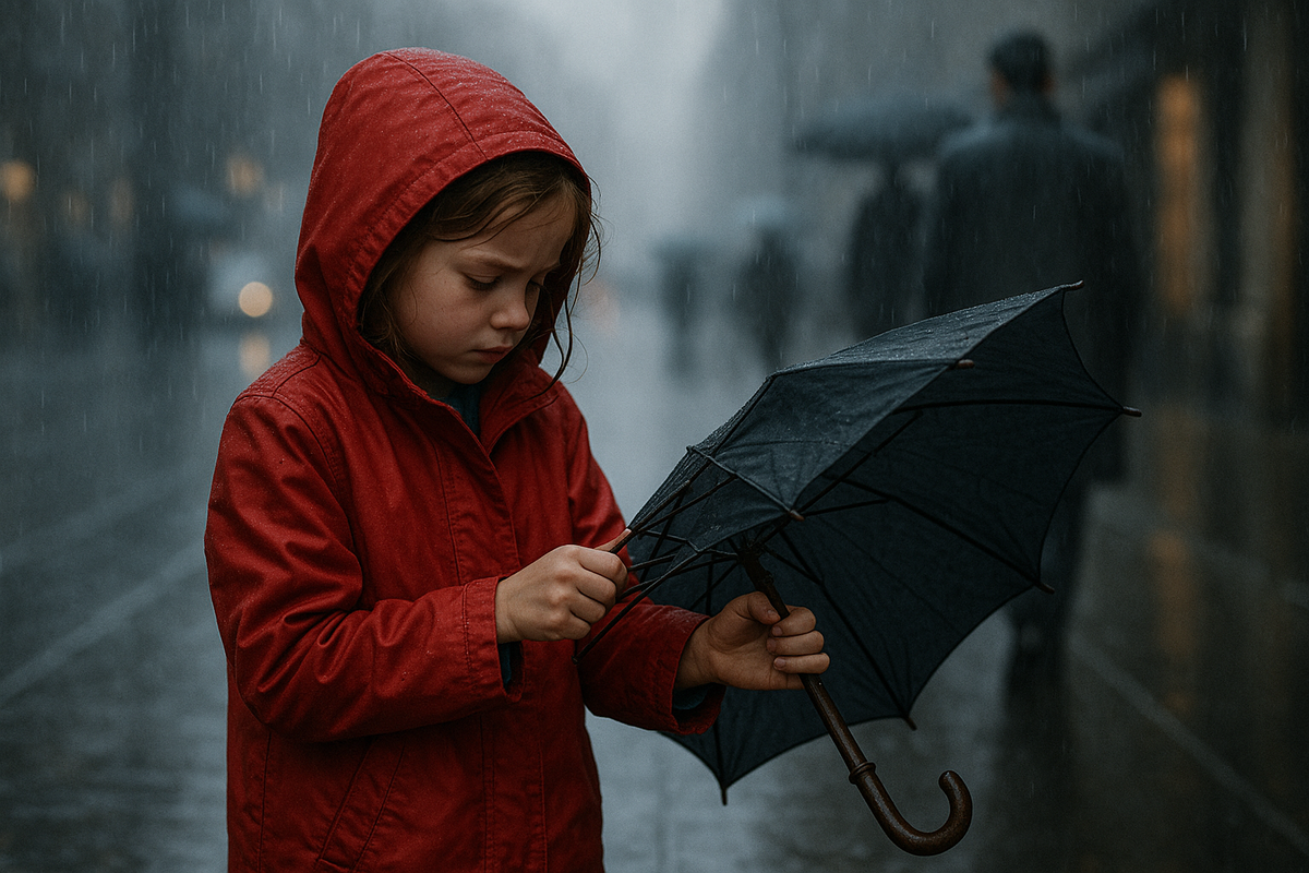 Дождь шёл стеной. Такой, от которого даже асфальт выглядел уставшим. Машины плыли, как лодки, прохожие прятались под навесами, а она — маленькая девочка в красной куртке — стояла у магазина и возилась с зонтом. Зонт был старым. Спицы торчали, ткань провисала, ручка болталась. Он больше напоминал скелет, чем защиту от непогоды. Но она упрямо старалась его починить — закусывала губу, дёргала ткань, разглядывала механизм. Ветер гнал капли по земле, подбрасывая их, как мелкие серебристые камешки. Дождь барабанил по навесу, словно старался подбодрить: «Ты справишься». Люди проходили мимо, спеша укрыться, кто-то с чашкой кофе, кто-то, не отрываясь от экрана телефона, кто-то с поднятым воротником, закрывшим пол-лица. Никто не заметил её. Никто не остановился. Она не плакала. Просто выглядела… слишком серьёзной для своих десяти лет. И очень одинокой. И вдруг — он. Вышел из магазина. Мужчина в сером пальто. Высокий, с лёгкой сутулостью и добрыми, уставшими глазами. Он остановился. Посмотрел на