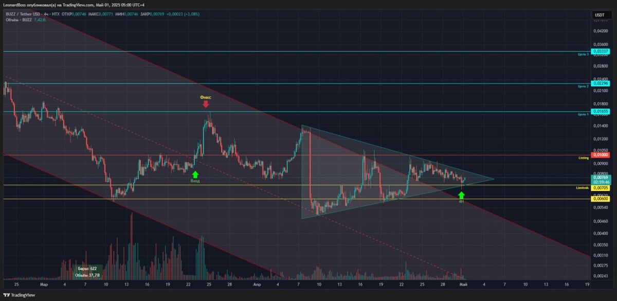 #BUZZ 🔼🔼🔼 ⚠️Свежий претендент на пару тройку иксов. Всё, что сейчас "модно"), есть: и падение от HI на 97%, и сбор сливок под Low уже после падения, и выход из нисходящего канала. Осталось выпрыгнуть из треугольника консолидации, можете дождаться этого события и действовать!! P.s. альты отлично себя повели на вечернем сквизе доминации BTC, чувствуется сила и настрой на дальнейший рост, не пропустите!!!