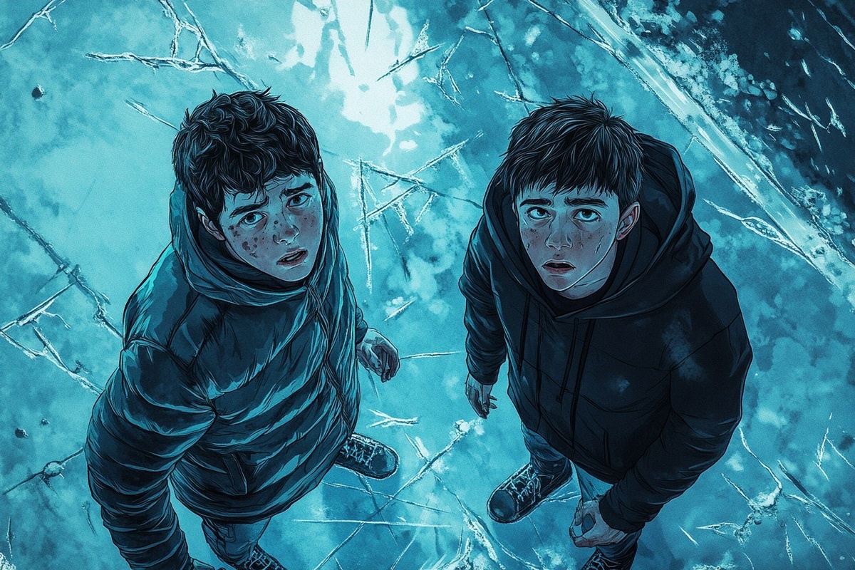 Создано на основе запроса: two teenage boys on a cracked frozen lake, one boy in a puffer jacket, other boy wearing a black hoodie jacket