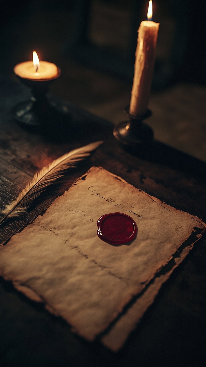 Создано на основе запроса: a highly detailed 18th-century secret letter sealed with red wax, placed on an aged wooden desk, dim candlelight casting long shadows, beside a feather quill and an inkwell, the edges of the parchment slightly burnt, ominous atmosphere, symbolizing betrayal and destiny, photorealistic, cinematic style, no people, --- Автоперевод: a highly detailed 18th-century secret letter sealed with red wax, placed on an aged wooden desk, dim candlelight casting long shadows, beside a feather quill and an inkwell, the edges of the parchment slightly burnt, ominous atmosphere, symbolizing betrayal and destiny, photorealistic, cinematic style, no people, Классно выглядит? 🤔 https://dzen.ru/id/65c0c65c86e4f837c27b24d7 #ИИ #AI #нейросеть #midjourney #art