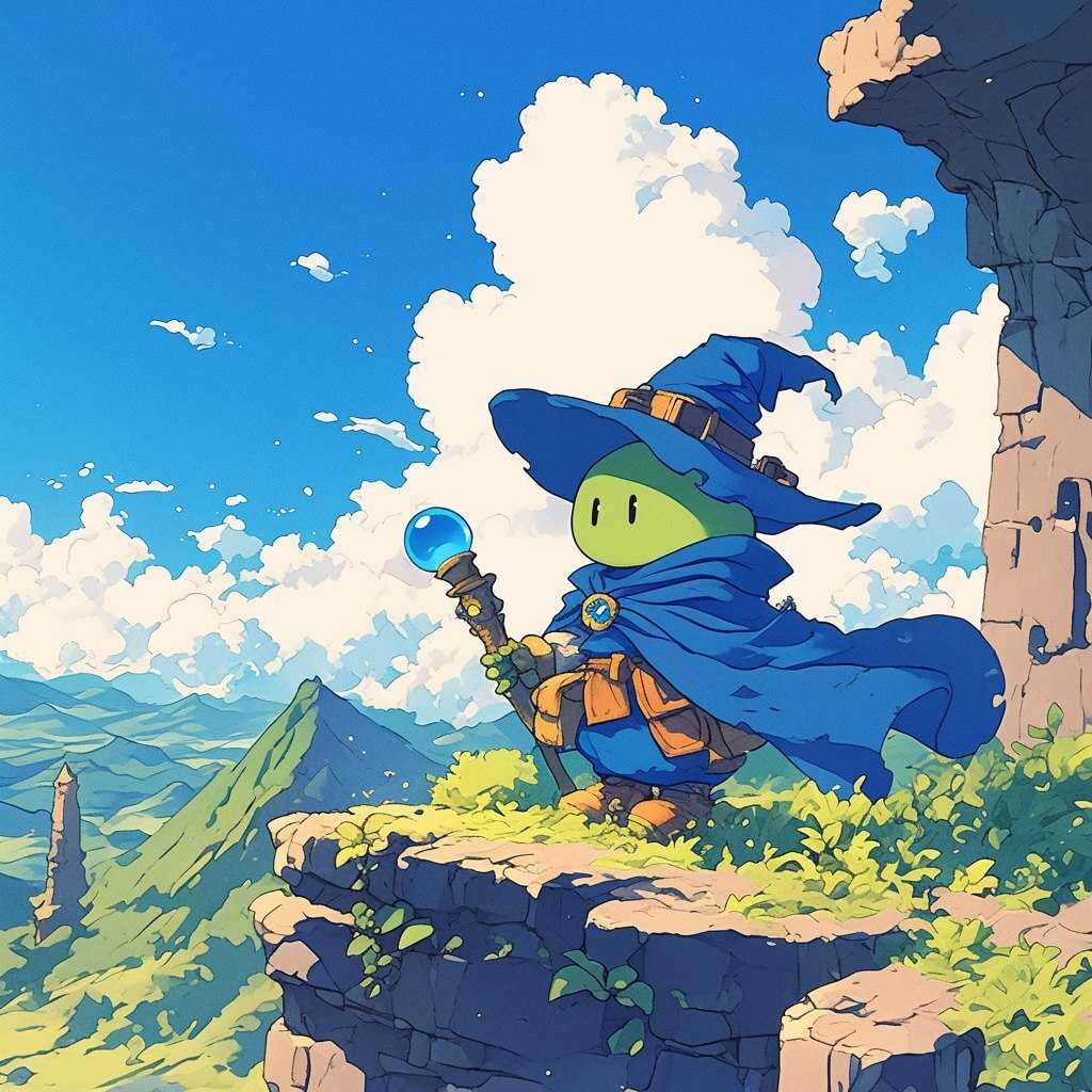 Создано на основе запроса: Tiny mage slime, green, adventurous, epic, looking at horizon, in the style of studio Ghibli, Poster