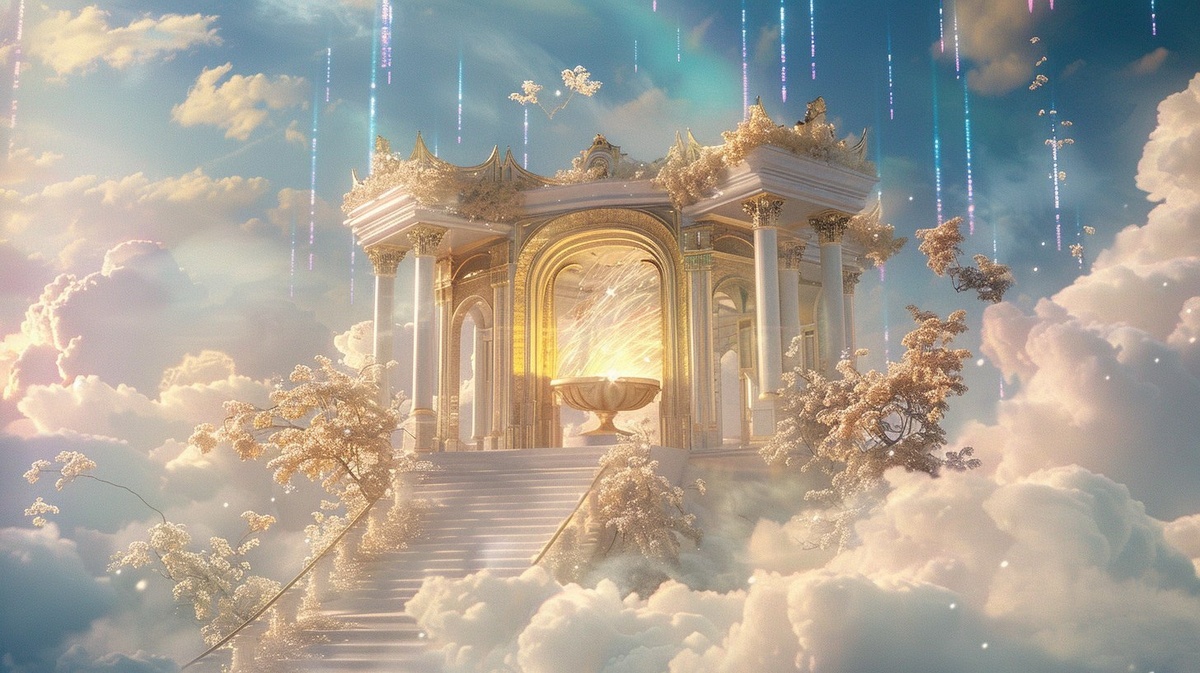 Создано на основе запроса: Photorealistic floating celestial temple in white and gold, made of smooth glowing marble and crystalline arches, suspended above a cosmic void. The temple hovers above misty clouds filled with rainbow light particles, floating flowers, holographic vines, and glowing crystals. At the center of the temple is a radiant pedestal with an open glowing book, pages illuminated with light codes. The sky is filled with soft auroras, nebula clouds, and shimmering glitter in colors #01E8CF, #9800FF, #DEFE08. High-resolution photorealism, dreamlike sacred aesthetic, no figures, cinematic light, abstract, 8K clarity --- Автоперевод: Фотореалистический плавающий небесный храм в белом и золотом, изготовленный из гладких светящихся мраморных и кристаллических арков, подвешенных над космической пустотой. Хорошо вышло? 🤔 https://dzen.ru/id/65c0c65c86e4f837c27b24d7 #ИИ #AI #нейросеть #midjourney #art
