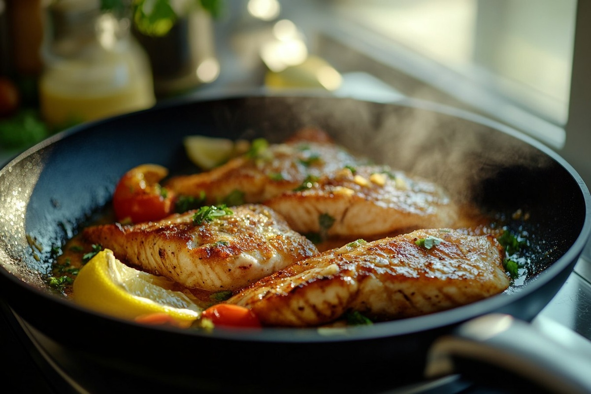 Создано на основе запроса: Title: Pan Fried Fish with Lemon Butter Sauce | STYLE: Close-up Shot right view | EMOTION: realistic as possible | SCENE: KEYWORD | TAGS: High-end food photography, clear composition, mouth-watering, indulgent, gourmet, cuisine, recipe | CAMERA: Nikon Z7 | FOCAL LENGHT: soft direction light | PRODUCTION : food stylist | TIME : daytime | LOCATION TYPE : kitchen near windows,