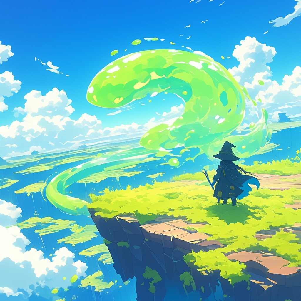 Создано на основе запроса: Tiny mage slime, green, adventurous, epic, looking at horizon, in the style of studio Ghibli, panoramic