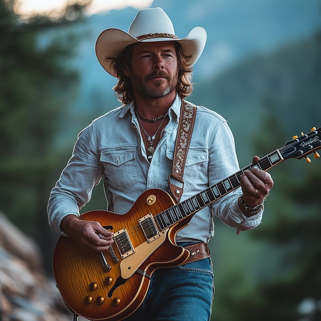 Создано на основе запроса: Olympic forest background, Middle age man 6ft tall with brown hair. Wearing blue jeans with brown buckled belt, Wearing long sleave white shirt, wearing white cowboy hat, playing a Gibson Les Paul Sunburst guitar with a large brown strap --- Автоперевод: Олимпийский лес в лесу, мужчина среднего возраста 6 футов высотой с каштановыми волосами. Круто выглядит? 🤔 https://dzen.ru/id/65c0c65c86e4f837c27b24d7 #ИИ #AI #нейросеть #midjourney #art