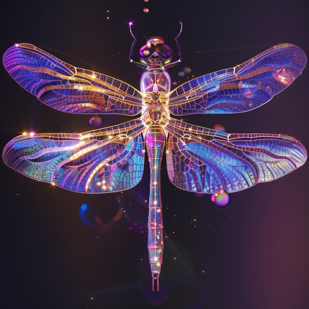 Создано на основе запроса: Single dragonfly, wings spread, glowing body with rainbow metallic shimmer, cosmic micro-particles sparkling off