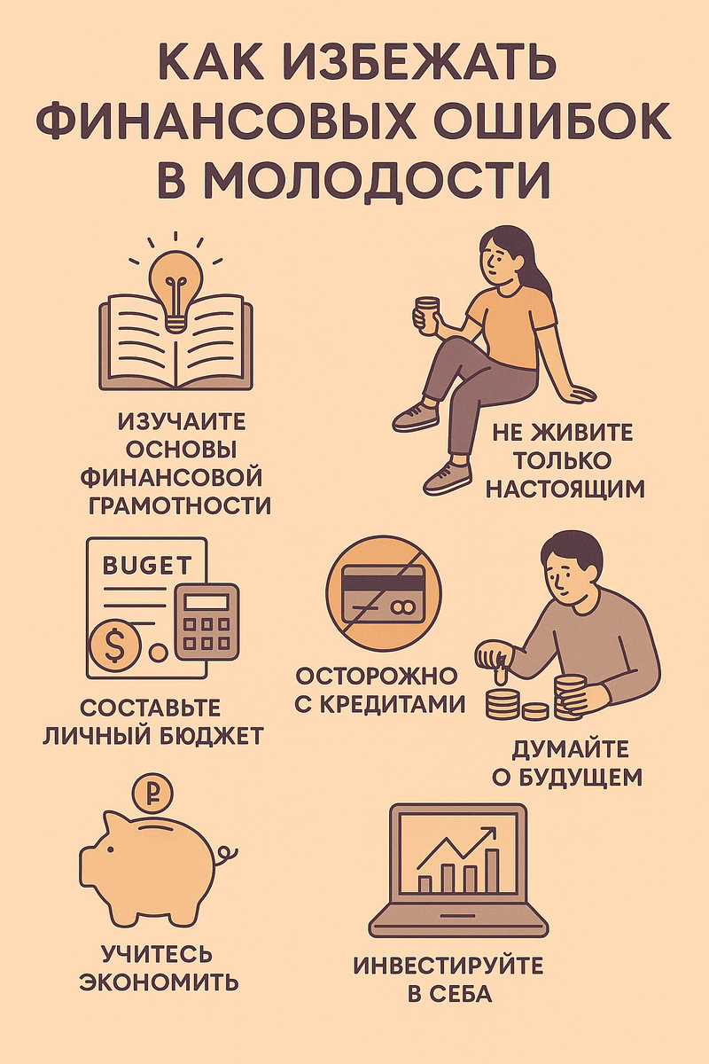 Молодость — это время возможностей, открытий и формирования жизненных привычек, в том числе финансовых. Ошибки, допущенные в юности, могут дорого обойтись в будущем. Чтобы избежать распространённых ловушек и научиться разумно управлять деньгами, важно выработать финансовую грамотность как можно раньше. 1. Осознайте ценность денег Многие молодые люди получают первые заработки и начинают тратить без задней мысли. Однако важно помнить: деньги — это не просто средство для покупок, это ресурс, который можно инвестировать в своё будущее. Учитесь видеть за каждой суммой потраченного — или сэкономленного — потенциал на развитие. Совет: ведите учёт доходов и расходов, чтобы понимать, куда уходят деньги. 2. Не поддавайтесь импульсивным тратам Покупка новой одежды, техники или еды в кафе «на эмоциях» — это классическая ошибка. Такая модель поведения может привести к постоянной нехватке средств. Совет: перед любой покупкой спросите себя — действительно ли это необходимо? Подождите 24 часа — если