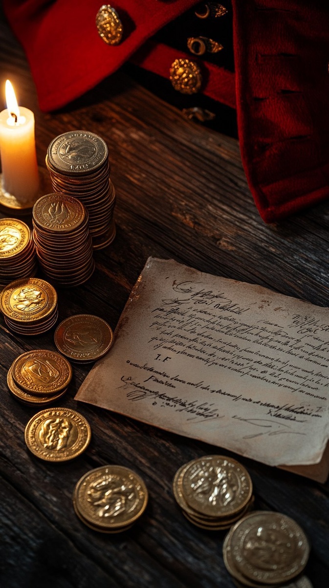 Создано на основе запроса: a symbolic scene showing stacks of British gold coins and a signed military commission scroll for the rank of