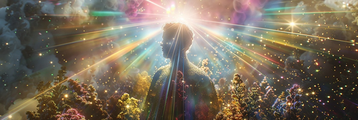 Создано на основе запроса: Abstract cosmic nature scene, divine rainbow light rays shining downward, embedded with glowing spiritual