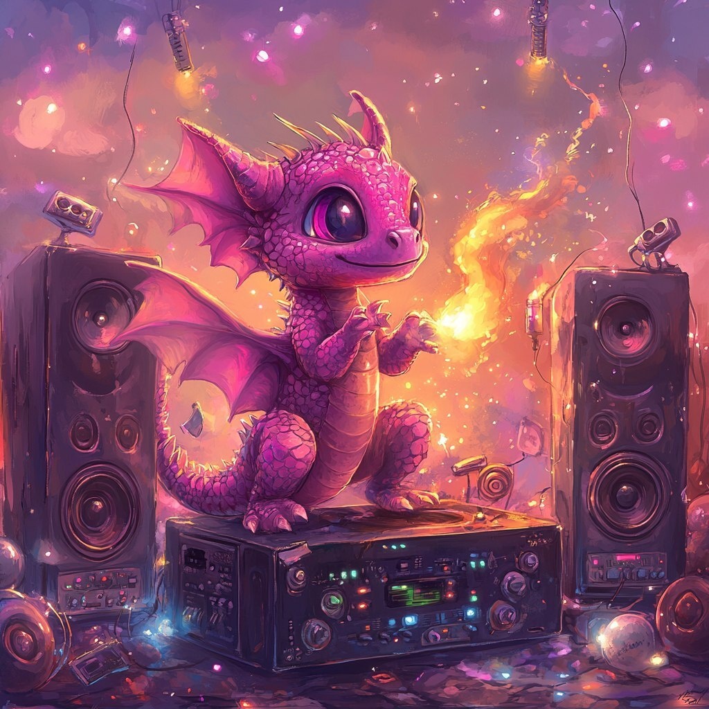 Создано на основе запроса: cute pink baby dragon with first breath of fire surrounded by music speakers and electroni music equipment