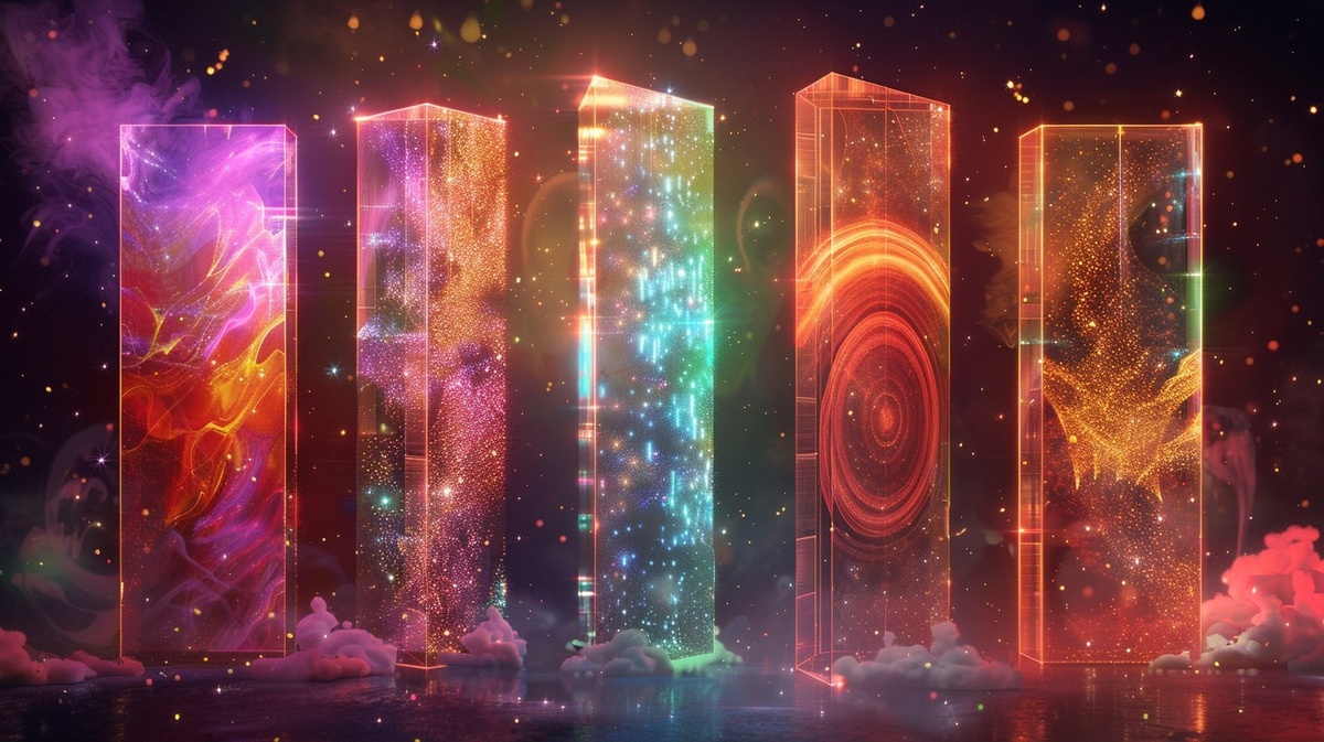 Создано на основе запроса: Ultra-realistic, high-definition spiritual scene with five glowing crystalline portals arranged in an arc, each radiating a distinct frequency. One glows with refracted galaxies (clairvoyance), one shimmers with soft wave rings (clairaudience), one radiates warm silk-like glitter (clairsentience), one bursts with flashing light codes and fractals (claircognizance), and one swirls with golden floral mist (clairalience). Each portal is outlined in holographic neon: #01E8CF, #9800FF, #DEFE08, radiant pink and emerald green. Glitter particles, floating crystals, soft cosmic light, photorealistic style, clean luxury feel, cinematic 8K, abstract --- Автоперевод: Ультрареалистичная духовная сцена высокой четкости с пятью светящимися кристаллическими порталами, расположенными в дуге, каждая из которых излучает отчетливую частоту. Красиво получилось? 🤔 https://dzen.ru/id/65c0c65c86e4f837c27b24d7 #ИИ #AI #нейросеть #midjourney #art