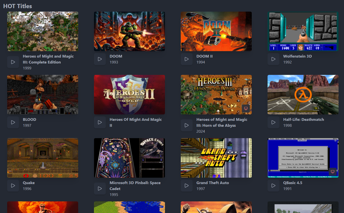 Как-то читал "Повелителей DOOM" - и подумал: "Вот было бы круто, если бы в каждую описываемую игру можно было бы тут же сыграть!" Даже уже начал потихоньку собирать собственные репаки игр, чтобы они были сразу готовы к запуску без установки и прочей возни. Хотел собрать себе некую коллекцию с удобным интерфейсом по типу RetroPi... потом подумал, чёрт, а как было бы круто сделать некий веб-ресурс, где все эти игры доступны откуда угодно. Начал гуглить про эмуляцию через WebAssebmly и... И случайно натыкаюсь на dos.zone. ОХРЕНЕТЬ!!! Да это ж прямо то, что было у меня голове!!! Открываю старый DOOM прямо в браузере, знакомая музыка, удобное управление, даже мультиплеер есть. Сижу и охреневаю: почему же я раньше об этом не слышал?! У них есть даже отдельный раздел с русскими версиями игр, а также от наших разработчиков: https://dos.zone/ru/