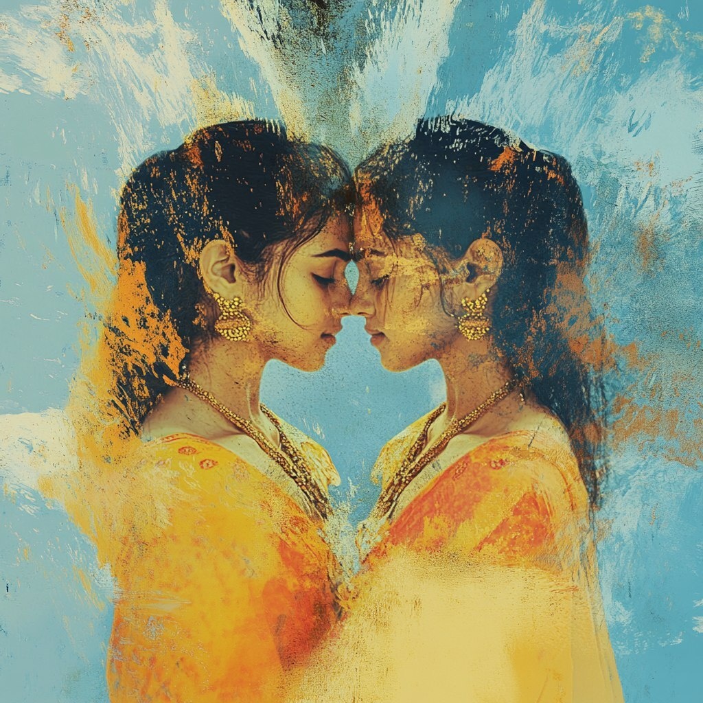 Создано на основе запроса: poster design, abstract, India, theater, two girls, multiverse, parallel time and space, turmeric, Morandi color