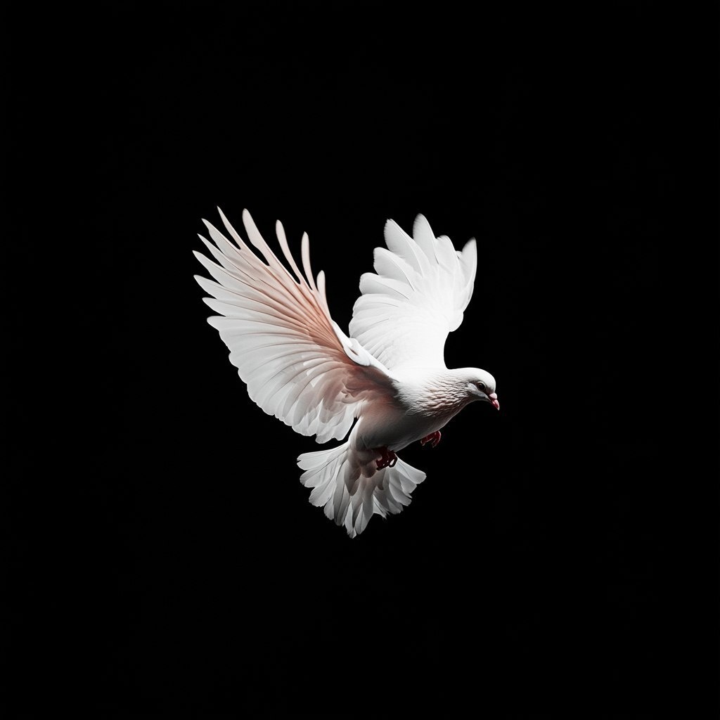 Создано на основе запроса: a white dove with its wings wide open as is floats in the air on a black background