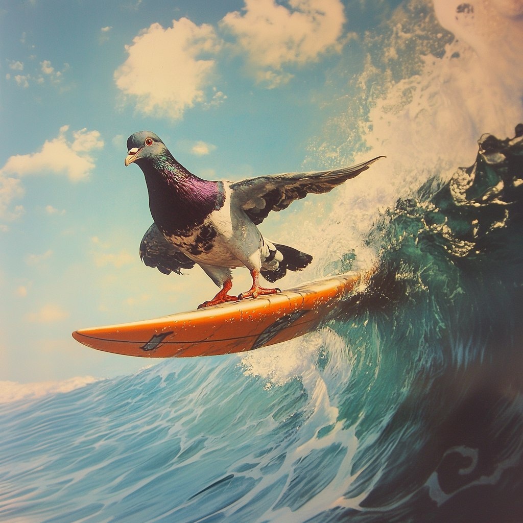 Создано на основе запроса: beach boy album cover of a pigeon riding a surfboard