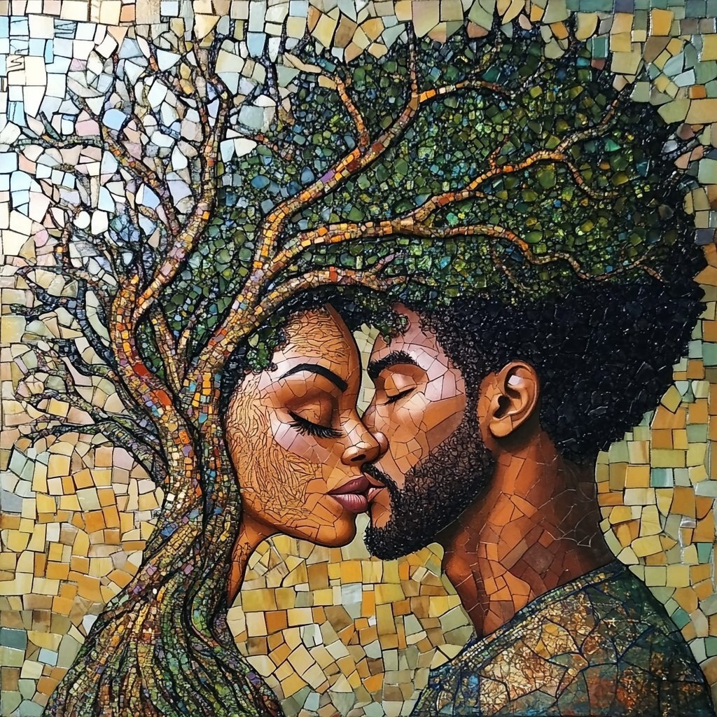 Создано на основе запроса: a mosaic colorful picture of a pretty black woman face with her hair green in a huge afro that resembles a tree branch kissing her man --- Автоперевод: Мозаика красочная картина симпатичной чернокожих лиц с ее волосами зелеными в огромной афро, которая напоминает ветвь дерева, целующую ее мужчину Как тебе картинка? 🤔 https://dzen.ru/id/65c0c65c86e4f837c27b24d7 #ИИ #AI #нейросеть #midjourney #art