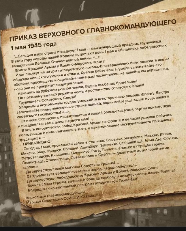 🪖Сегодня наша страна празднует 1 мая — международный праздник трудящихся. В этом году народы нашей Родины встречают день 1 мая в обстановке победоносного завершения Великой Отечественной войны. <…> Воины Красной армии и Военно-морского флота! Идет последний штурм гитлеровского логова. В завершающих боях покажите новые образцы воинского умения и отваги. Крепче бейте врага, умело взламывайте его оборону, преследуйте и окружайте немецких захватчиков, не давайте им передышки, пока они не прекратят сопротивление. Находясь за рубежом родной земли, будьте особенно бдительны! По-прежнему высоко держите честь и достоинство советского воина! 🪖 Трудящиеся Советского Союза! Упорным и неутомимым трудом умножайте всестороннюю помощь фронту. Быстро залечивайте раны, нанесенные стране войной, поднимайте еще выше мощь нашего советского государства! <…> От имени Советского правительства и нашей большевистской партии приветствую и поздравляю вас с днем Первого мая!