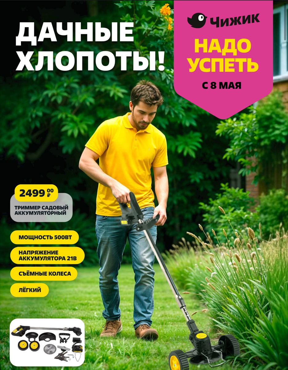 Приветствую всех читателей! Решила поделиться первыми эмоциями от нового каталога магазина Чижик! Уже совсем скоро, на следующей недели, с 8 мая — стартует обновление ассортимента, так что в этой статье, рассмотрим анонс и новый завоз ассортимента в магазин. Сразу хочу напомнить: всё, что вы видите на моих ресурсах — это чистая информатика. Никакой рекламы, никаких обязательств покупать. Это просто моя попытка делиться свежими акциями, ценами и отзывами. Моё мнение субъективно, и цель одна — поддержать вас в поиске выгодных покупок! Эта статья буквально набрана на бегу, потому что меня ждёт ещё столько интересного впереди! Прошу простить, если где-то выскочат маленькие шероховатости текста — стараюсь писать оперативно, чтобы информация пришла к вам первой! 😅 Тем, кто пропустил мой предыдущий обзор о новинках в ЧИЖИКе, обязательно зайдите сюда 👇 Обложка сразу радует глаз интересной новинкой — появляется аккумуляторный садовый триммер. Аккумуляторный триммер позволяет быстро пр