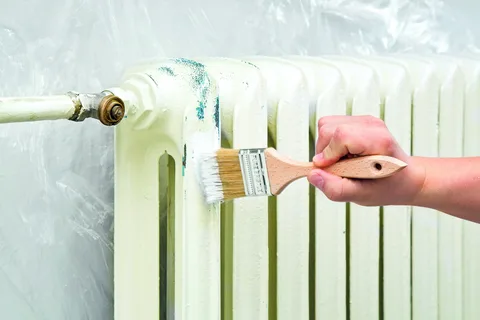 - Если старая краска в хорошем состоянии и совместима с новой (например, акриловая поверх акриловой), грунтовка не обязательна. - При смене типа краски (например, масляная → акриловая) нанесите универсальную грунтовку для улучшения адгезии. 6. Выбор материалов: - Краска: Термостойкая эмаль для радиаторов (алкидная или акриловая). Алкидная долговечнее, акриловая — быстрее сохнет и без резкого запаха. - Инструменты: Узкая кисть с длинной ручкой или изогнутой щетиной для труднодоступных мест. Можно использовать краску-спрей для ровного слоя. 7. Покраска: Смотрим: ПОКРАСКА БАТАРЕИ - Перед началом: Закройте пол и стены вокруг батареи пленкой или газетами. - Техника покраски: - Начинайте с внутренних секций, двигаясь сверху вниз. - Наносите краску тонкими слоями, избегая потеков. Как правило, батареи отопления красятся в 2–3 слоя. Прежде чем наносить следующий слой краски, нужно дать высохнуть предыдущему, для этого достаточно 20–40 минут. После того, как нанесён последний слой крас
