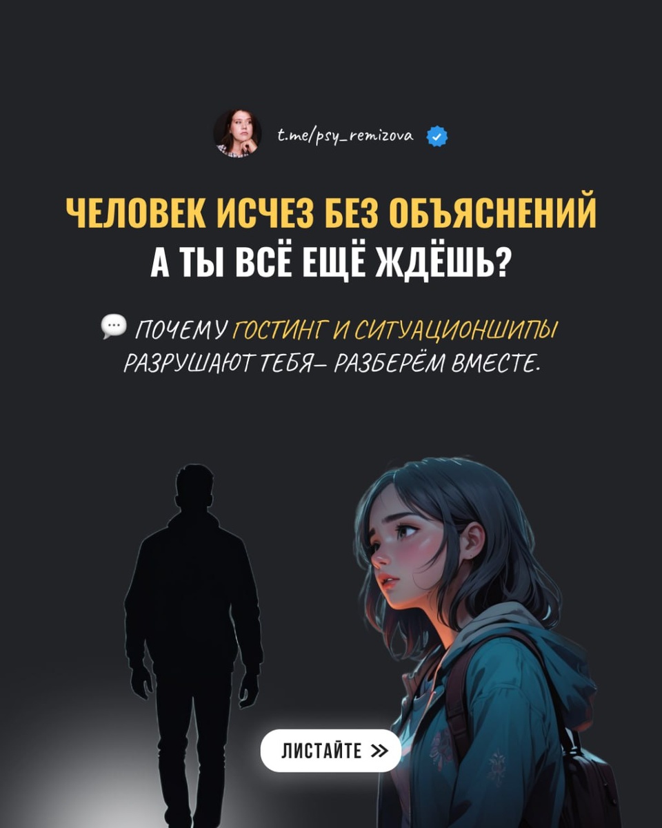 Гостинг и ситуэйшеншипы - слышали об этих явлениях? 🔴 💔Исчезнуть без объяснений или годами не определять статус отношений — это новые реалии. Но какую цену мы платим за эту "свободу"? И как не потерять себя в мире эмоциональной неопределённости? Разбираю в карусели 👐