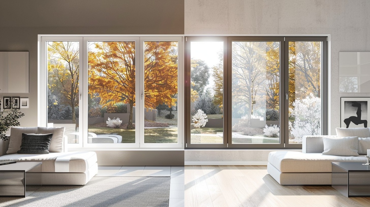 Создано на основе запроса: Split-screen comparison of two modern window installations: on the left, a clean white PVC window with soft