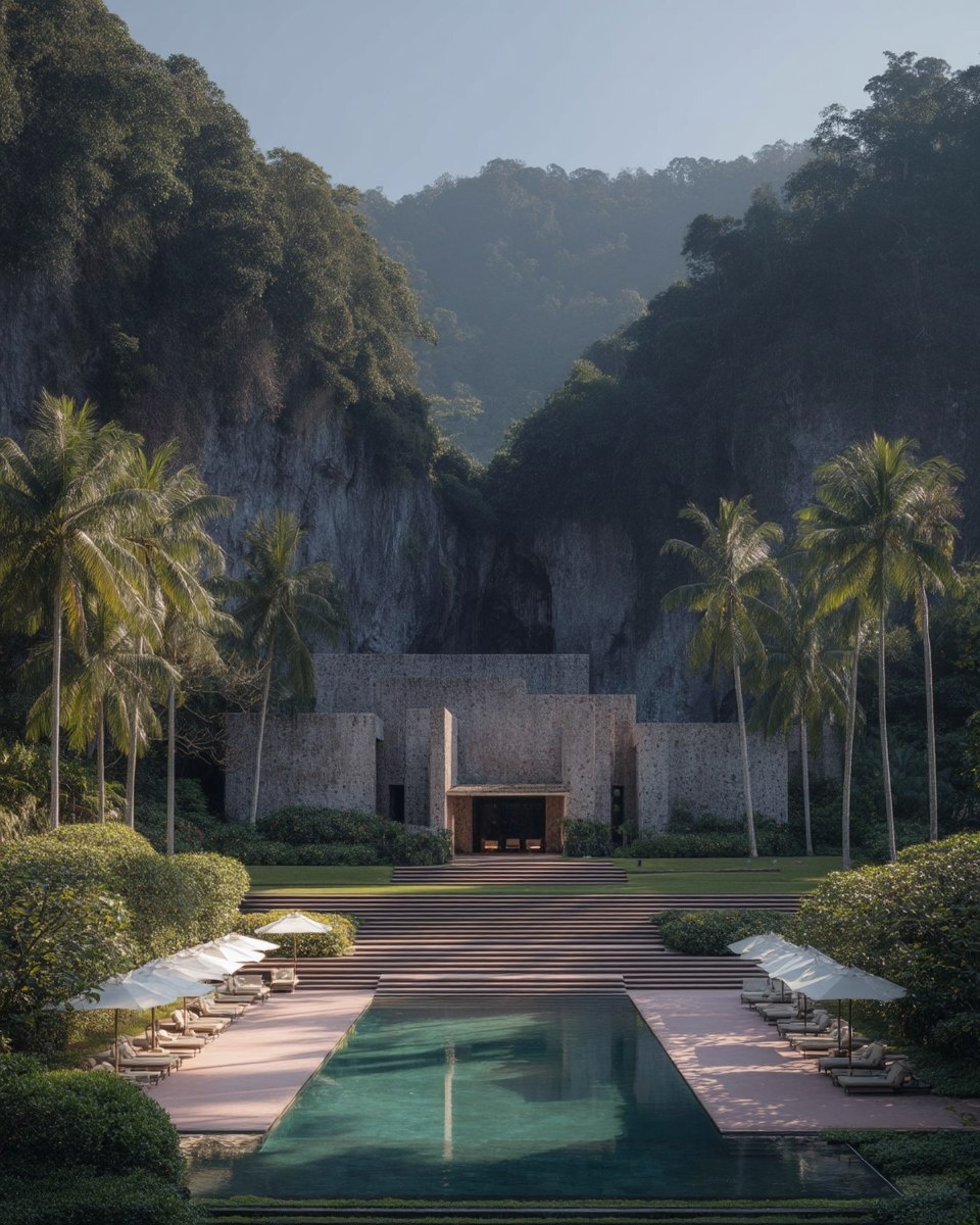 Создано на основе запроса: Ground level shot of a long swimming pool with pink water and stone steps surrounded by lawn terraces with sun umbrellas on them. The building is brutalist in style, designed in the style of Japanese architect Tadao Ando for Aman Resorts. Set among lush trees, rocky walls and thick jungle --- Автоперевод: Уровень земли в длинном бассейне с розовой водой и каменными ступенями, окруженными газонными террасами с солнечными зонтиками на них. Как тебе эта иллюстрация? 🤔 https://dzen.ru/id/65c0c65c86e4f837c27b24d7 #ИИ #AI #нейросеть #midjourney #art