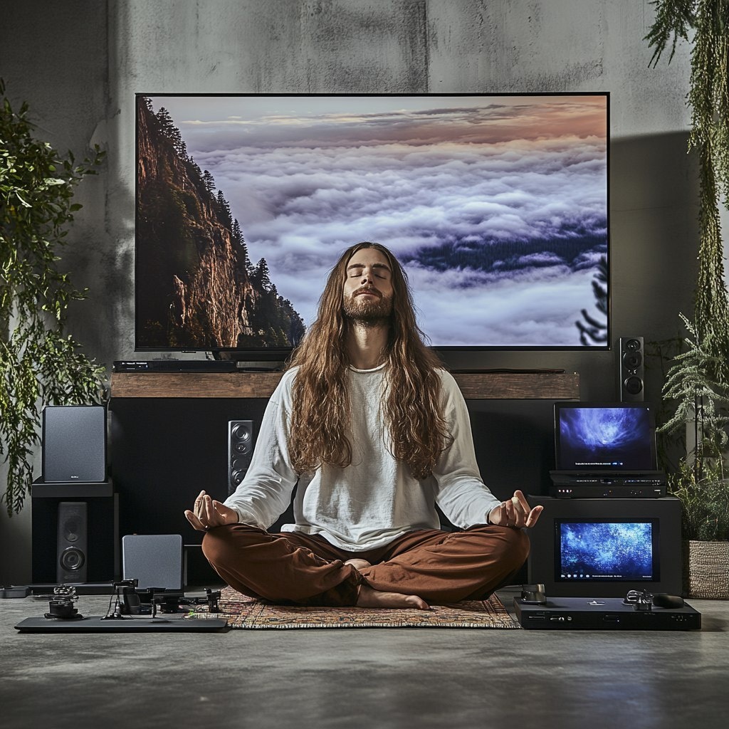 Создано на основе запроса: On a samsung led tv there is a yoga guru with long hair sat next to many samsung tech devices