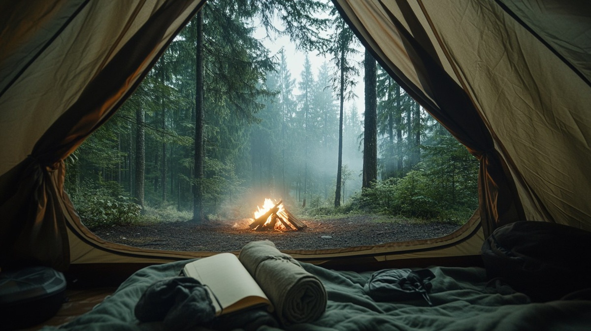 Создано на основе запроса: Looking out from inside an A-Frame tent with scattered gear and a forest journal near a rolled cozy blanket