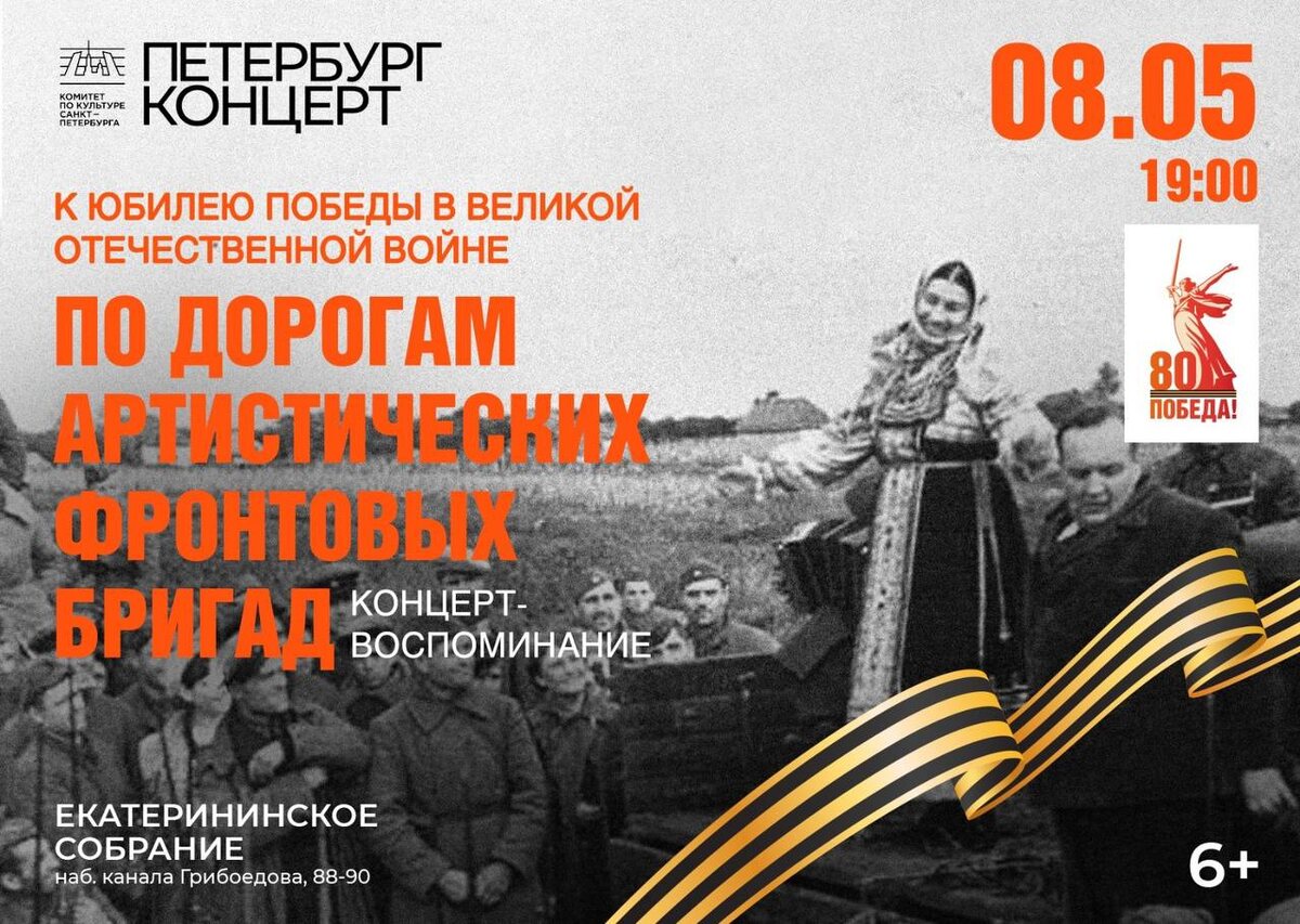 8 мая в преддверии празднования Дня Победы «Петербург-концерт» предлагает вспомнить о самоотверженности и профессиональном подвиге артистов, певцов, музыкантов, которые в годы Великой Отечественной войны в составе фронтовых бригад ежедневно выступали перед бойцами советской армии в воинских частях, госпиталях, на вокзалах, в партизанских отрядах. Программы выступлений строились по принципу сборного концерта: стихи, отрывки из прозы, популярные песни, музыкальные номера. Так же выстраивает концерт «По дорогам артистических фронтовых бригад» его создатель — народный артист России Сергей Новожилов. Биография этого человека удивительна. Он вышел на сцену в семь лет, во время Великой Отечественной войны читал стихи перед солдатами 194-го стрелкового полка на передовой и в госпиталях, и до сих пор остается одним из самых востребованных артистов. В Малом зале Екатерининского собрания в исполнении солистов «Петербург-концерта» — народного артиста России Сергея Новожилова, заслуженной артистк