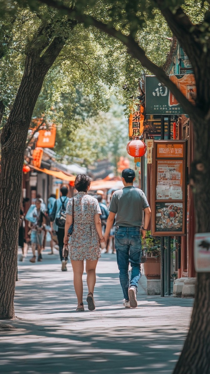 Создано на основе запроса: tourists in modern clothing walking past the forbiden city in beijing with signs for restrooms