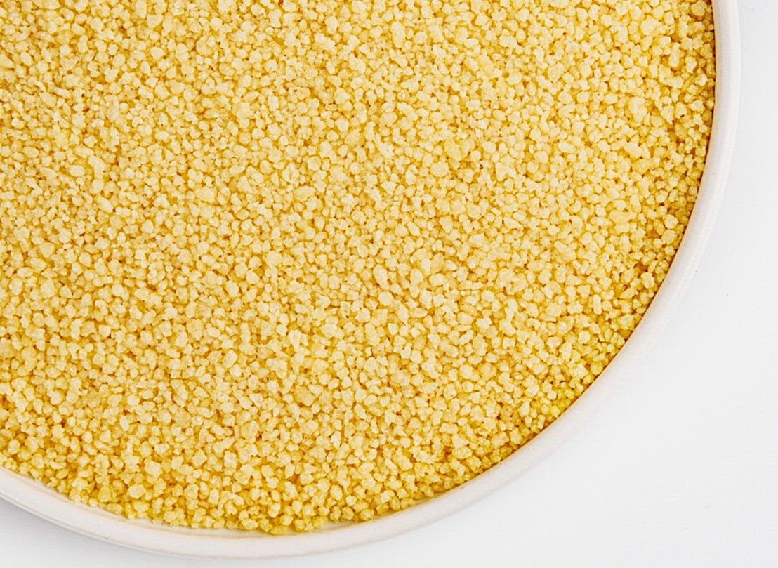 Внешне кускус представляет собой очень мелкие гранулы или крупинки, напоминающие манную крупу.