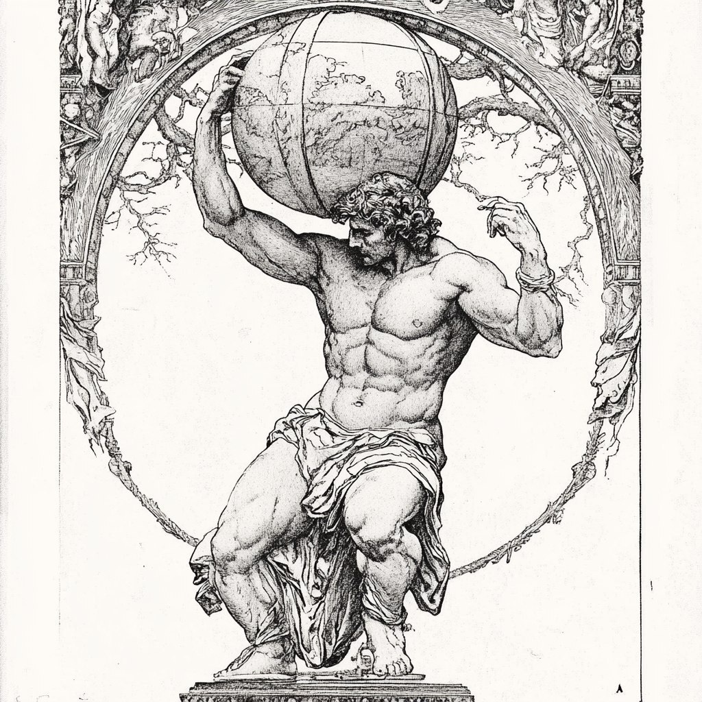 Создано на основе запроса: a full-body drawing of Atlas holding the world - art nouveau style - ornate