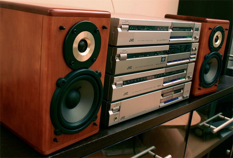 VICTOR SX-EX7S Акустические системы 60W - 6 Ohm Разные по назначению, но объединенные единым стилевым решением стерео компоненты изготовлены по винтажному фундаментально. Каждый блок имеет приличный вес и их приятно складывать один на другой, словно слитки серебра. Органы управления скрыты за откидными панелями, придавая системе вид в стиле минимализма.. Открыв крышки, первое, что бросается в глаза, кнопки органов управления окрашены в два цвета, по функциональной принадлежности. Самой редкой и необычной составляющей комплекта является микро кассетная дека, которая умеет работать с METAL микрокассетами JVC D-M3. Крайний раз такая была замечен