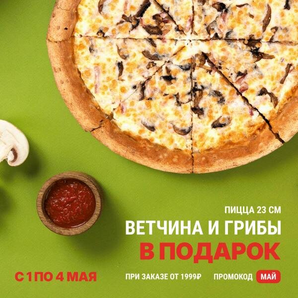В майские праздники — пицца в подарок! С 1 по 4 мая при заказе от 1999₽ дарим пиццу «Ветчина и грибы» 23 см — бесплатно! Просто укажи промокод МАЙ при оформлении заказа. Это не грибной бред, это — настоящая акция от Папа Джонс! Празднуй вкусно, заказывай с выгодой 👇🏻 papajohns.ru/novosibirsk #ПапаДжонс #маяпицца #грибывподарок #акция