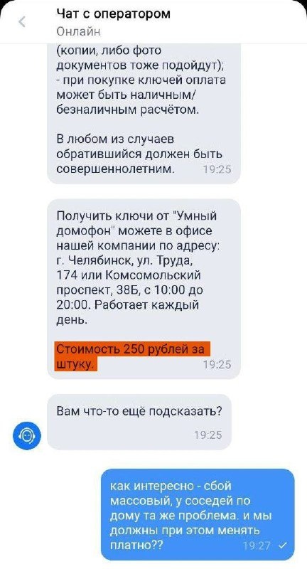 Жители Северо-Запада пожаловались, что из-за сбоя на умных домофонах «Интерсвязи» им не удавалось попасть домой: перестали срабатывать ключи 🔚В чате компании предлагали разные решения: запомнить время прикладывания и написать в чат, заказать новый ключ за 250 рублей или звонить соседям, чтоб открыли, — рассказала читательница @74.ru Екатерина. Ключи в доме на Комсомольском, 85 перестали срабатывать 24 апреля. Дверь не открывалась, выдавая ошибку: якобы приложить пытаются ключ от другого подъезда. И если у молодежи еще был выход с приложением на телефоне, то старикам из-за сбоя попасть домой стало значительно сложнее. 🔚Сбой массовый, у соседей по дому та же проблема. И мы должны при этом менять платно??? — предложение о платной замене ключей в чате с техподдержкой особенно «воодушевило» жителей. Ответ компании. В «Интерсвязи» объяснили, что двери перестали открываться из-за обновления программного обеспечения. Отключились якобы именно дубликаты ключей, сделанные в сторонних салона