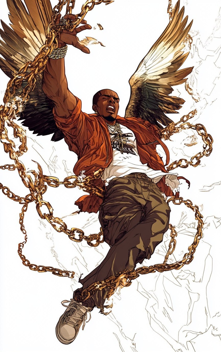 Создано на основе запроса: graphic novel illustration of a hiphop rapper mixed with a falcon entangled in golden chains