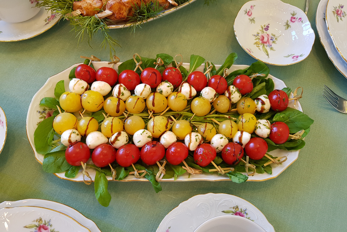 Добрый день, дорогие друзья! Сегодня я представляю вашему вниманию рецепт известного салата с острова Капри, но оформленного в виде канапе, что позволит придать праздничному столу более интересный вид или насладиться данным салатом на пикнике. Для приготовления нам понадобятся: помидоры черри красные 200 грамм, помидоры черри желтые 200 грамм, 200 грамм мини шариков моцареллы, руккола 150 грамм, укроп 15 грамм, масло оливковое 15 грамм, бальзамический уксус 15 грамм, бальзамический соус 15 грамм, соль 3 грамма, черный молотый перец 1 грамм. Приготовление: укроп измельчить и смешать с бальзамическим уксусом, оливковым маслом, солью и перцем. На шпажки надеть, чередуя, помидоры черри разных цветов и шарики моцареллы. Рукколу промыть, обсушить и выложить на блюдо. Томаты и моцареллу на шпажках обмакнуть в заправку и выложить на листья рукколы. Сверху полить бальзамическим соусом. Приятного аппетита!