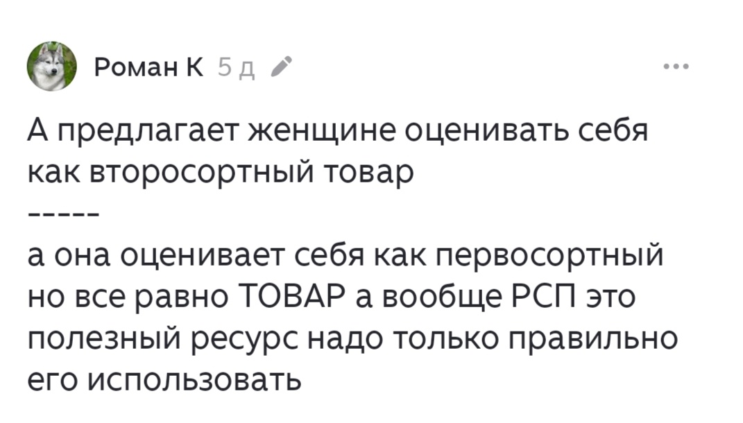 В статье "Что ждёт разведёнок после развода" мужчины активно отметились мнением, что женщины с детьми - это ресурс, а они (мужчины то есть) - потребители. Дамы - товар, а они - купцы. Вы нам предложите выгодные условия, а мы может и согласимся, но торговаться будем до посинения.