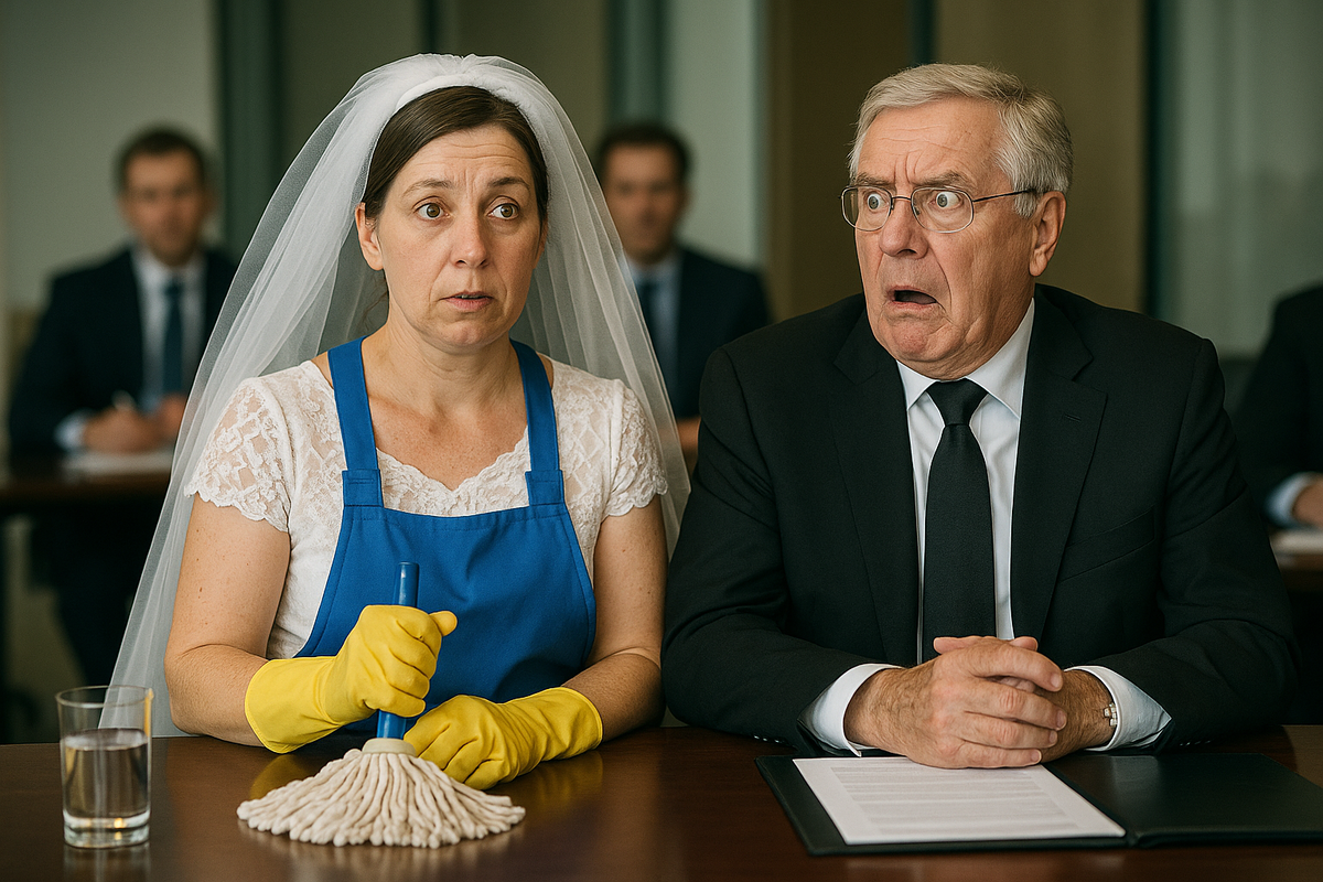 Валентина снова мыла полы в коридорах, словно ничего не случилось. Сотрудники косились на неё с недоумением: вчера в свадебном платье на приёме, сегодня — с тряпкой и ведром. Но она лишь спокойно улыбалась, не обращая внимания на шепотки.